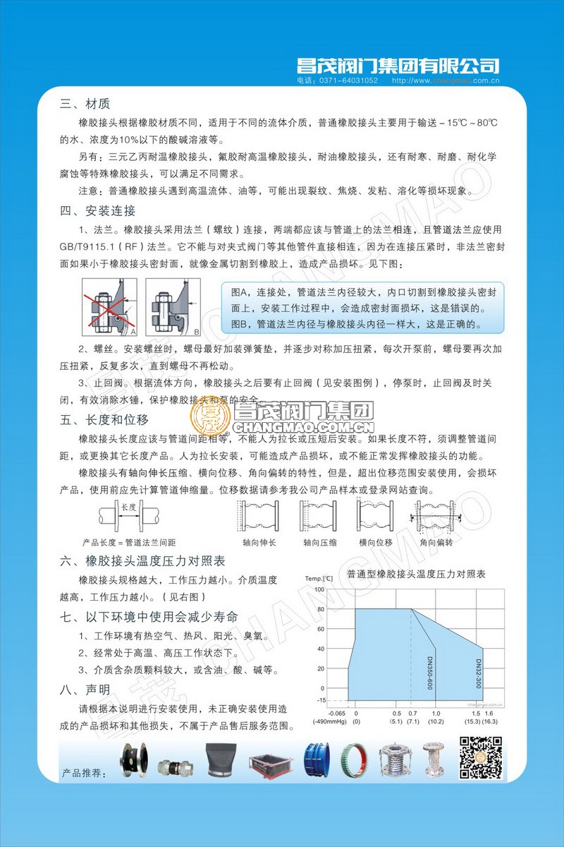 安裝時請按照《產品安裝使用說明書》進行安裝,特別注意橡膠接頭兩端的管道是否有效固定(安裝能承受管道推力的固定支架)。因為橡膠接頭不能承受管道運行時產生的推力,如果沒有固定管道,管道會移動,拉壞橡膠接頭,造成安全問題。